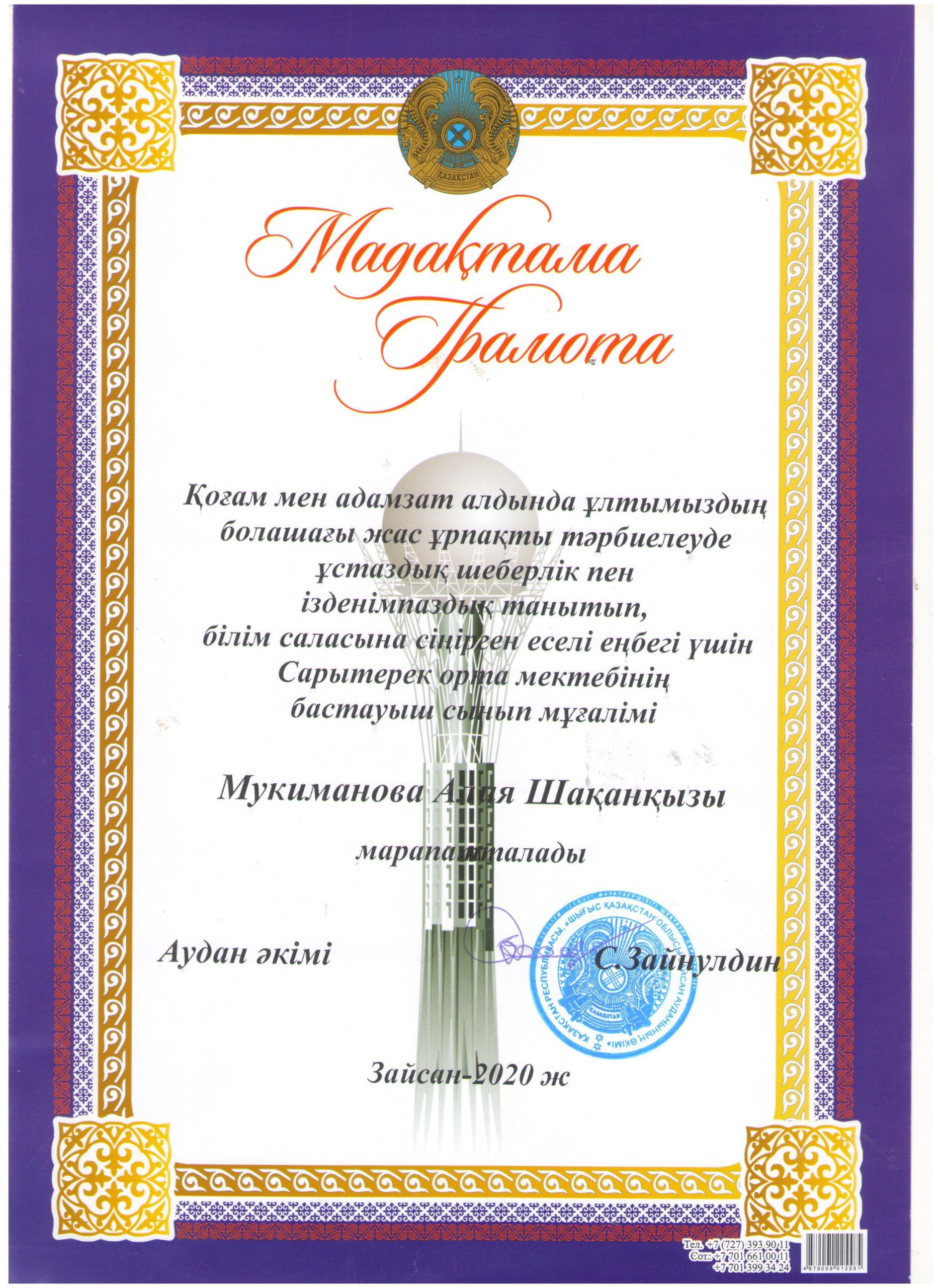 Қоғам мен адамзат алдында ұлтымыздың болашағы жас ұрпақты тәрбиелеуде ұстаздық шеберлік пен ізденімпаздық танытып, білім саласында сіңірген еселі еңбегі үшін “Сарытерек орта мектебі” КММ-нің бастауыш сынып мұғалімі Мукиманова Алия Шақанқызы Зайсан ауданы әкімі Серік Зайнулдиннің мадақтама грамотасымен марапатталды.