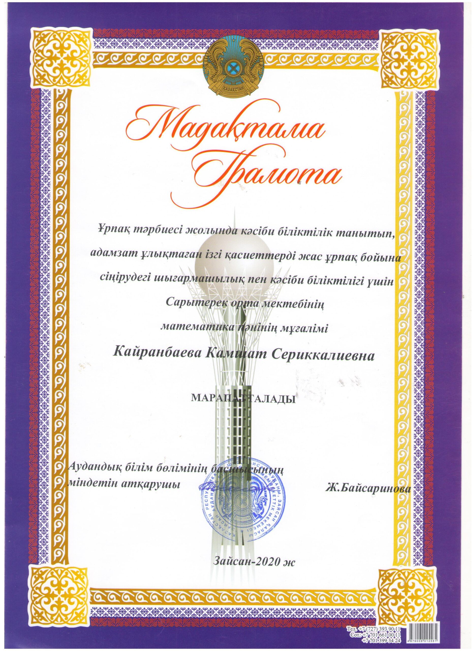 Ұрпақ тәрбиесі жолында кәсіби біліктілік танытып, адамзат ұлықтаған ізгі қасиеттерді жас ұрпақ бойына сіңірудегі шығармашылық пен кәсіби біліктілігі үшін “Сарытерек орта мектебі” КММ-нің математика пәнінің мұғалімі Кайранбаева К.С. мен музыка пәнінің мұғалімі Уалиева А.С. Зайсан аудандық білім бөлімінің мадақтама грамотасымен марапатталды.